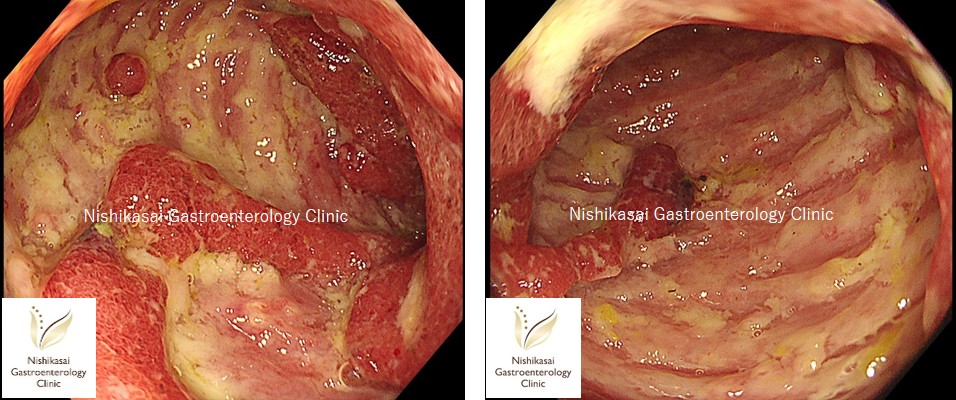原因は完全には解明されておらず、本邦では『指定難病』の一つに定められています。本症例は長期にわたる粘血便や腹痛、体重減少を認めていました。内視鏡所見は、広範な深掘れ潰瘍がみられ、粘膜は脆弱であり、穿孔のリスクが極めて高い重症潰瘍性大腸炎と診断しました。直ちに提携する大学病院に入院のうえ全身管理、強力な内科的治療(ステロイド強力静注療法、抗TNF-α抗体製剤投与等)が行われましたが、最終的には手術(大腸全摘)が行われました。このような重症例は稀ですが、長引く下痢や粘血便がみられる場合は、なるべく早めにご相談下さい。